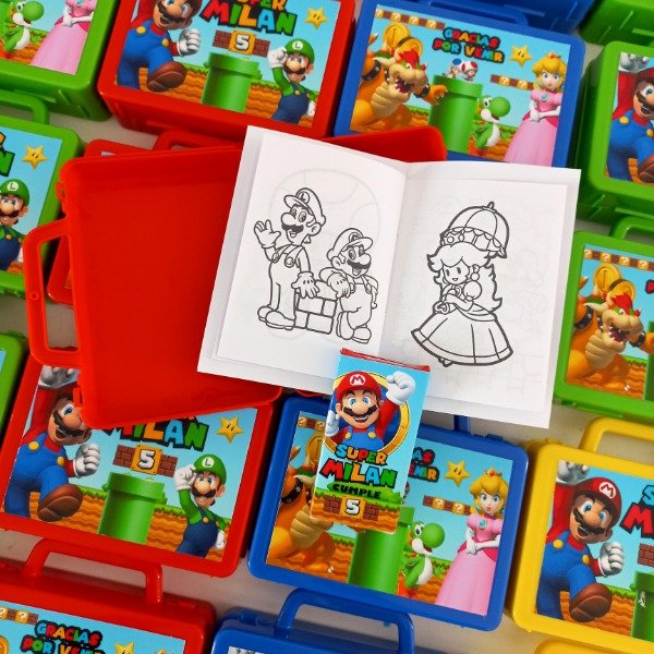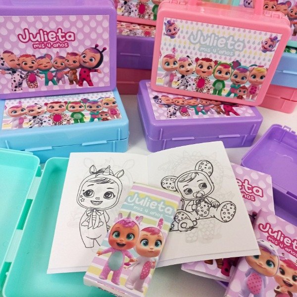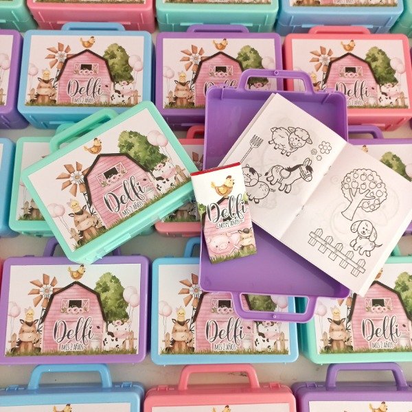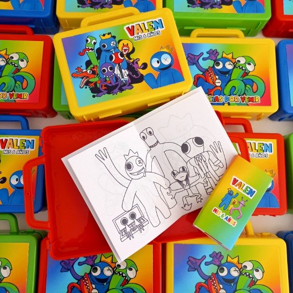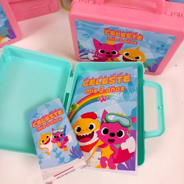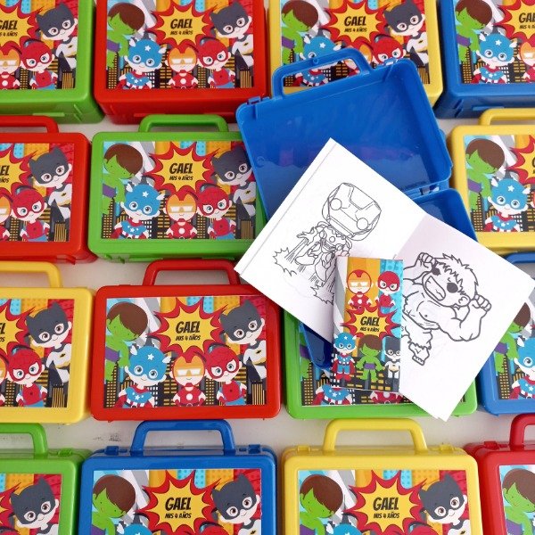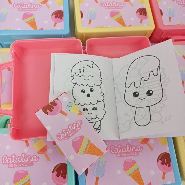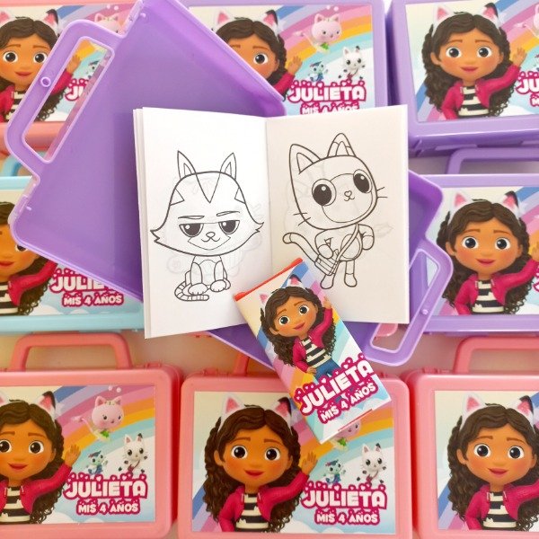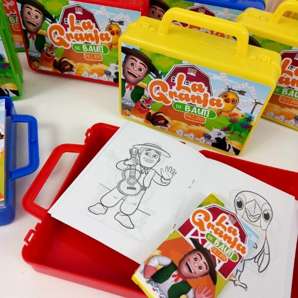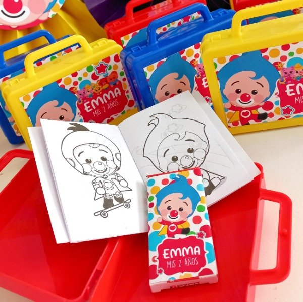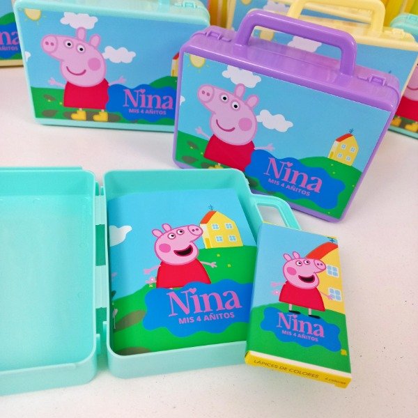Valijtias de plastico personalizadas con cuadernito para pintar y lapices de la tematica.